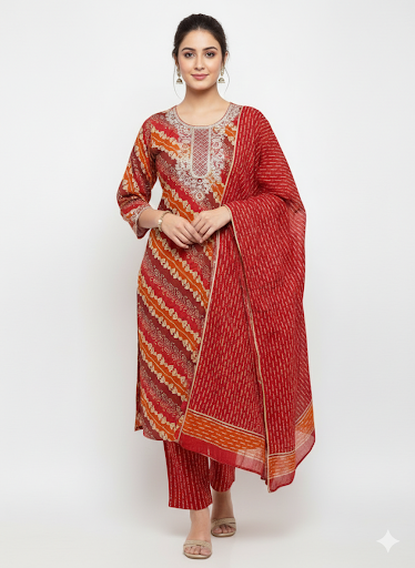 Design: Features a stunning diagonal Bandhani-style print in rich earthy tones of maroon and orange.