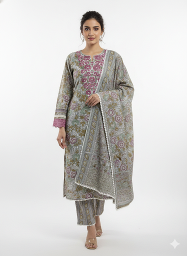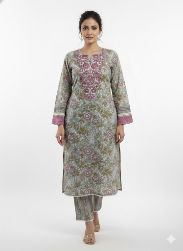 Design: Intricate floral print with detailed embroidery on the neckline and sleeve borders.