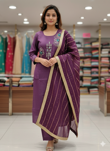Elevate your ethnic wardrobe with this sophisticated 3-piece suit set, designed to blend traditional craftsmanship with a modern silhouette. The deep mauve (plum) hue offers a rich, regal look suitable for festive occasions, office celebrations, or evening gatherings.