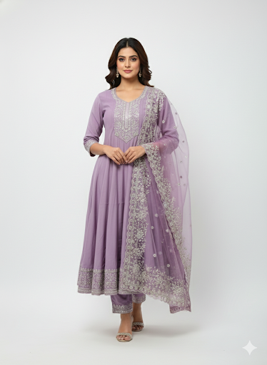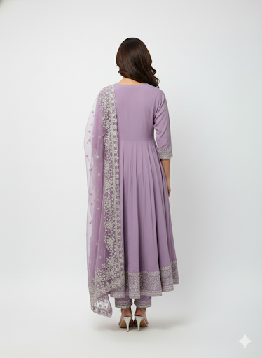 Radiate grace at your next celebration with our Lavender Embroidered Anarkali Set. Crafted for the woman who loves a blend of traditional craftsmanship and contemporary style, this three-piece set features a beautifully flared silhouette in a soothing lavender hue.