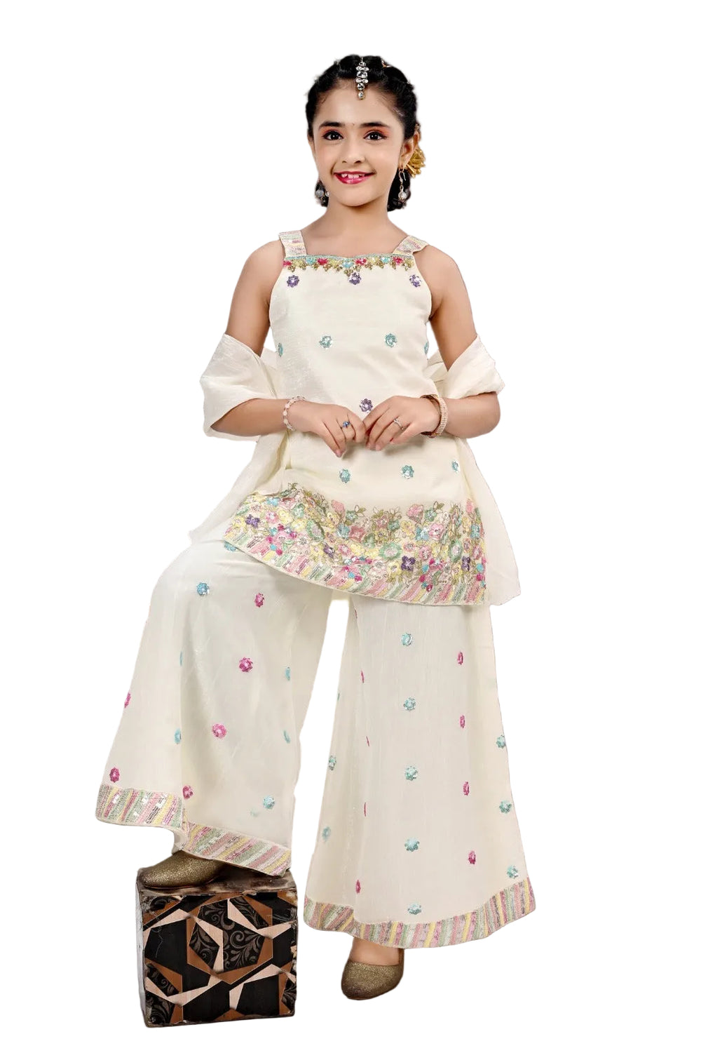 Add a touch of elegance to your little one’s wardrobe with this stunning Cream Ethnic Sharara Set, exclusively on Vyasakart. Perfect for weddings, festivals, and special celebrations, this outfit blends traditional charm with modern comfort.